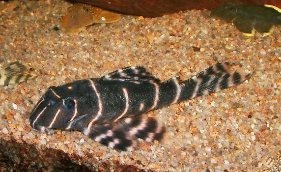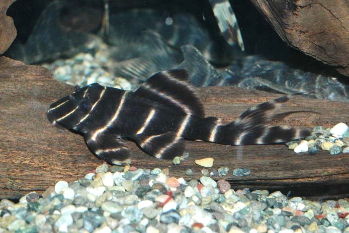 黒い魚体に細い白線を数本持つ小型プレコです。