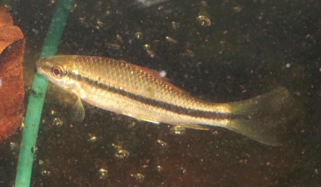 体側に1縦線を持ち、背鰭は赤く尾鰭は薄黄色になる美しいオステオキルスです。