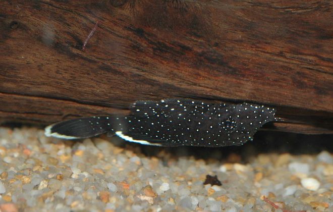 黒い体色に鮮明な白色の小点を散らす美しいブッシープレコです。